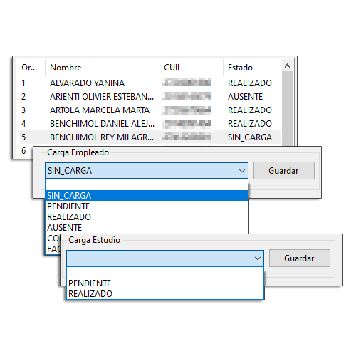 Esta funcionalidad permite cargar un estado para cada estudio y para cada empleado dentro de una asignación. Esto permite tener control sobre el avance de ejecución de la asignación y también permite generar listados en excel de los empleados y estudios pendientes de realización.
