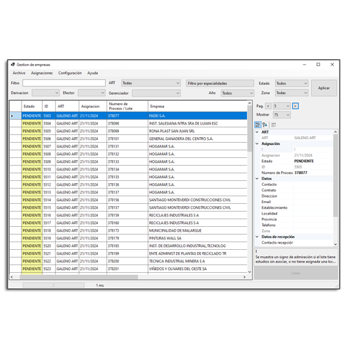 GestionEmpresas es un software de gestión, desarrollado y diseñado para Empresas de Medicina Laboral que realizan exámenes médicos periódicos. Funciona como aplicación de escritorio, pero trabaja completamente online. Organiza las asignaciones de empresas de las ART para mejorar la ejecución y el cumplimiento del trabajo, y ofrece distintas herramientas para optimizar el tiempo que ocupan sus empleados en realizar tareas manuales y repetitivas.