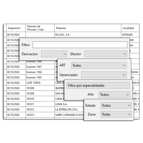 Permite organizar las asignaciones según múltiples criterios como empresa, zona, especialidad, entre otros, optimizando el acceso a los datos relevantes.